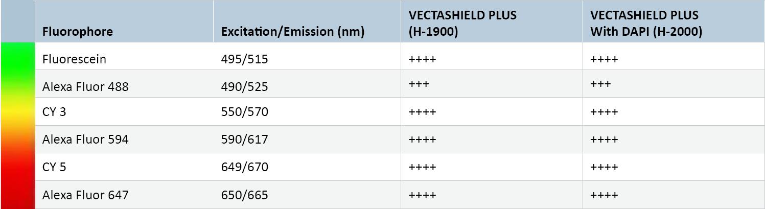 VECTASHIELD PLUS 防淬灭封片剂适用于在可见光和远红外光谱范围内的荧光基团。
