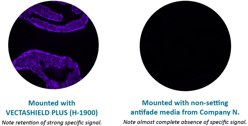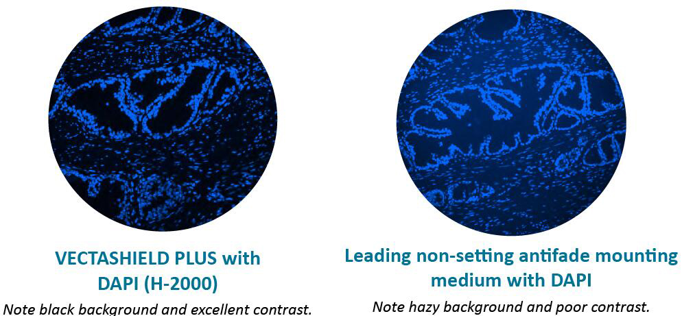 VECTASHIELD PLUS防淬灭封片剂与市场其他品牌封片剂相比无固有的背景,可与周围组织形成鲜明的对比从而获得更优质的信号和成像。